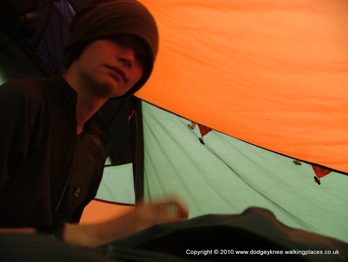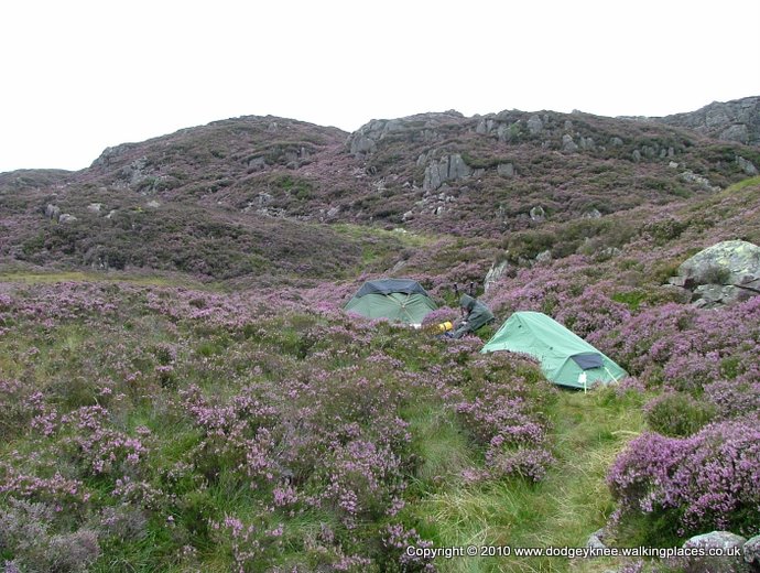 We entered a rather boggy moor where finding a campsite proved rather a challenge. We finally picked a delightful spot in a small beallach amongst the heather on Great Crag (440m), just as the clouds closed in and it started to rain a little. A leisurely dinner, washed down with some beer Keith had bought at Keswick. Mike thought carrying heavy beer bottles was not a good idea but they went down rather well and on reflection they were a good idea. The rain picked up and we had an early night.